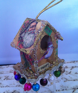 Rock Candy Distress Stickles all over the house to give it a pretty sparkle then glued on charms. Julie made the paper beads by rolling triangle shaped strips around a pokey tool then glueing the ends. These were strung on to eyepins and suspended them from chain on the bottom of the house. Add a few buttons and a cute hanging ribbon and the little bird house was transformed in to a pretty shabby chic cuckoo clock to hang on the Christmas tree